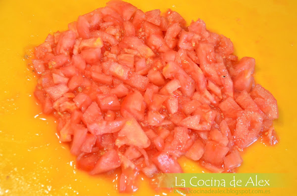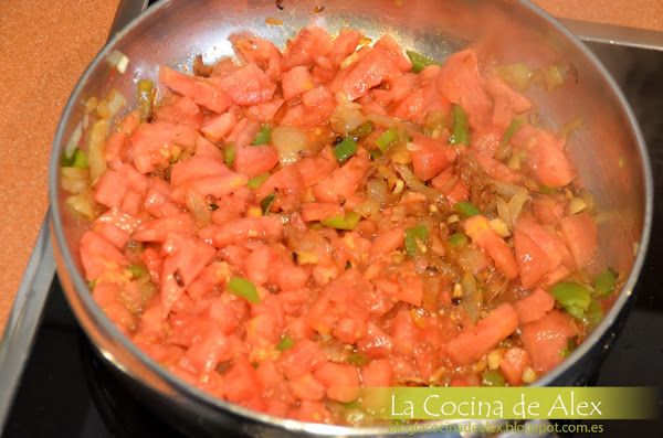 Pelamos y cortamos los tomates y se lo agregamos a la mezcla anterior hasta que reduzca y pierda todo el agua.
