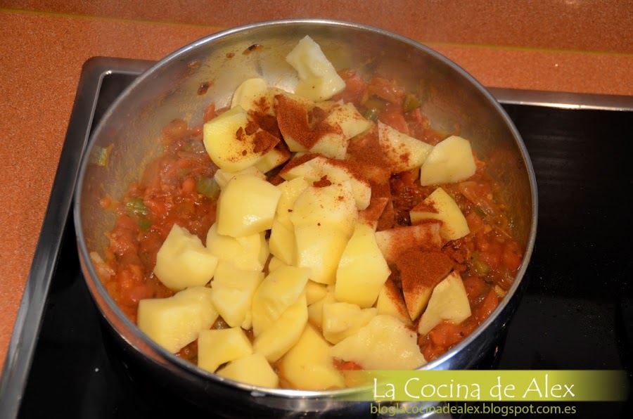 Pelamos y cortamos la patata "cascándola" para que cuando la pongamos en el guiso ayude a que espese el caldo. Las agregamos a la verdura anterior junto con el pimentón dulce y removemos todo bien.