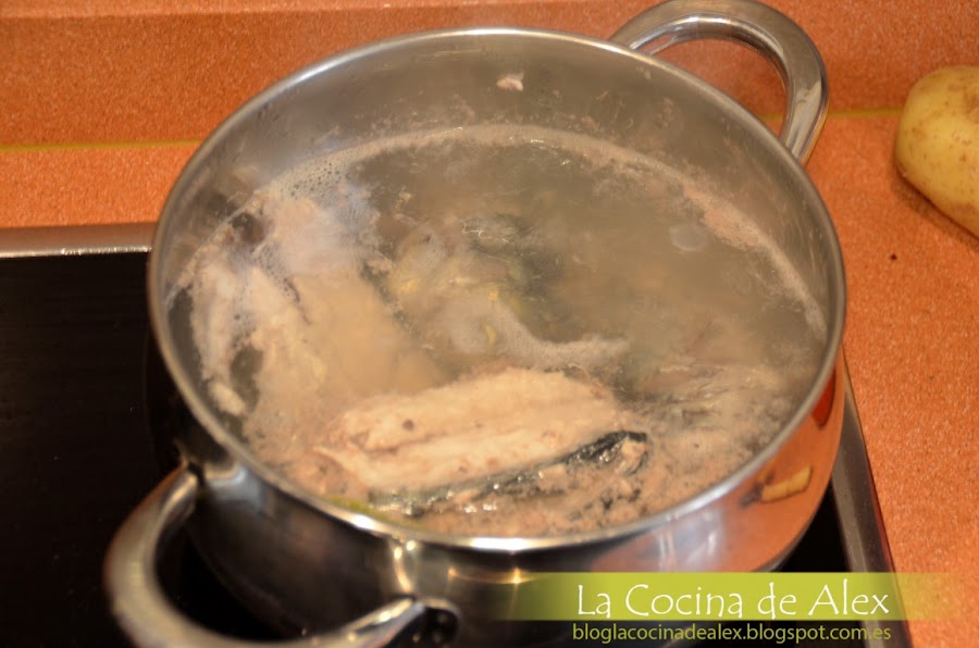 En un cazo con agua ponemos a cocer a fuego medio con un poco de sal y pimienta, las espinas, las colas y las cabezas de la caballa que habíamos reservado en el paso anterior, esto lo dejamos mientras que hacemos los siguientes pasos, a fuego medio bajo para conseguir un caldo con todo el sabor del pescado.