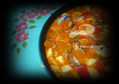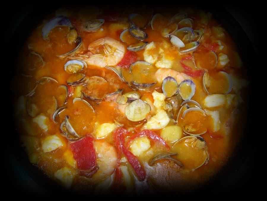 Cuándo esté añadir el congrio en dados, los langostinos, las almejas y los pimientos dejar unos 5 min