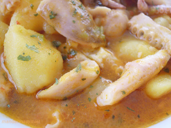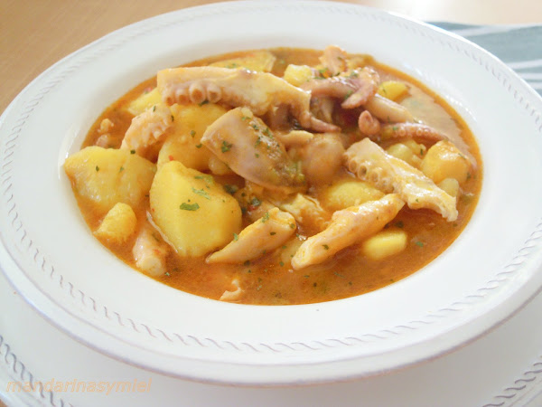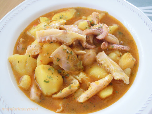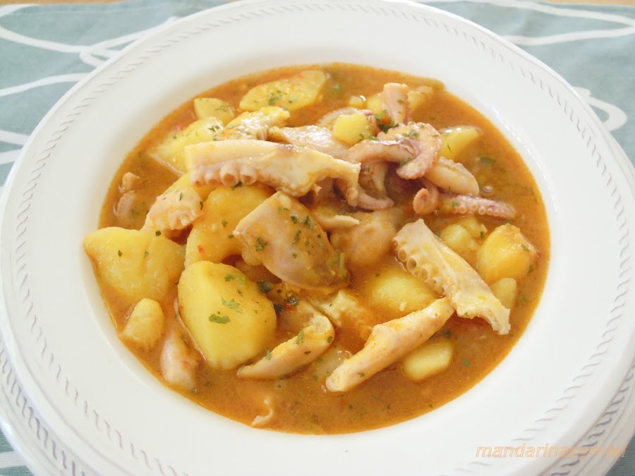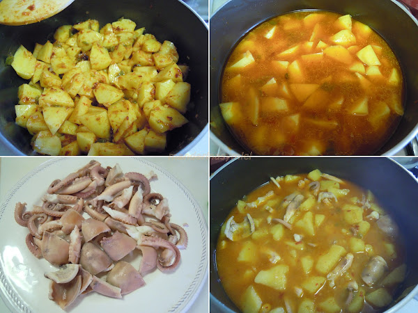 Sinceramente, no sabía como iba a prepararlos, pero pensando en ello, recordé un plato delicioso que me sirvieron en un restaurante del Grao de Castellón en las jornadas del pulpo....."Marmitako de pulpo".