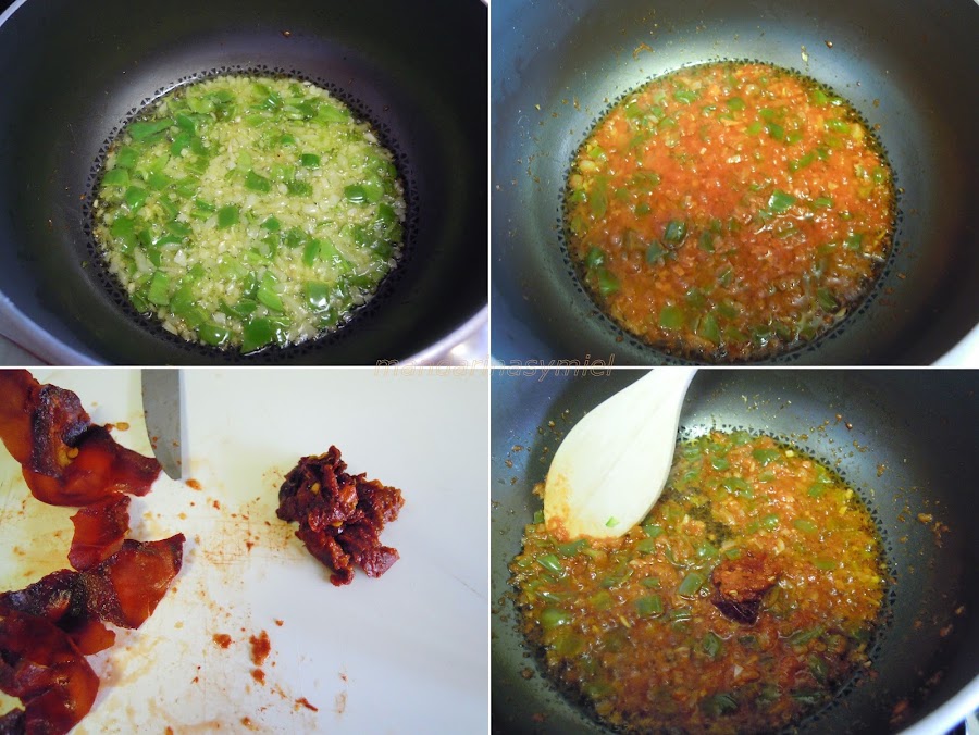 Saca la carne de las ñoras con la punta de un cuchillo e incorpórala al sofrito de verduras, mezcla bien.