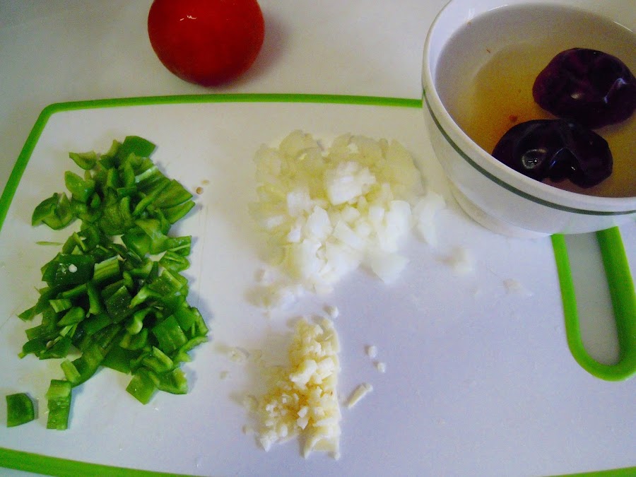 Corta en trocitos pequeños la cebolla, el pimiento y los dientes de ajo.