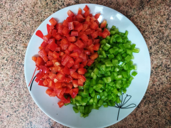 Lavamos y troceamos el pimiento verde y rojo, lo añadimos a la sartén.