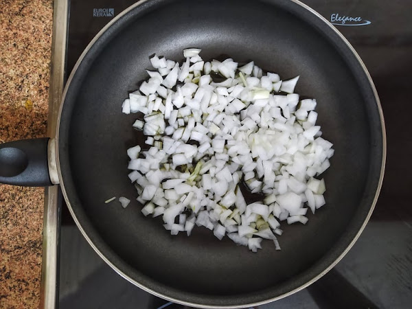 En una sartén a fuego medio, ponemos un chorrito de aceite de oliva y la cebolla previamente troceada en trozos pequeños, y añadimos una pizca de sal para que poche más rápido.