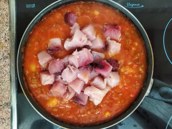 Añadimos un vaso de vino blanco y dejamos que se evapore el alcohol. A continuación, añadimos también una cucharadita de pimentón dulce, salsa de tomate frito casero y un pimiento choricero, dejamos que se cocine unos quince o veinte minutos a fuego medio bajo.
