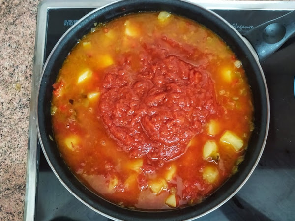 Escurrimos y aclaramos la patata. Cuando esté la verdurita pochada añadimos la patata, ya que está precocinada y no necesita más que un golpe de calor.