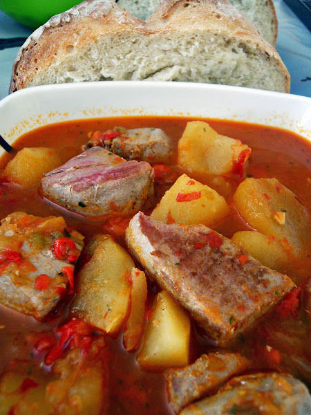 Salteamos en una sarten e atun a tacos, muy poco , solo marcarlo, y lo añadimos a la olla y cocinamos con el caldo 2 minutos, no lo hagáis mas o se os quedara seco, en dos minutos esta hecho, no os preocupéis que no queda crudo. Apartar del fuego y dejar un par de minutos que repose.