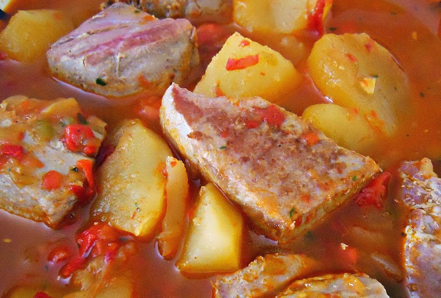 Por otro lado escaldamos en agua los pimientos choriceros y le sacamos la pulpa, y la añadimos al guiso, cuando el tomate este cocinado añadimos el medio vaso de vino, dejamos que reduzca el alcohol y cubrimos con caldod e pescado o agua , podéis hacer un caldo con cabezas y espinas de pescado y alguna verdura como lo verde del puerro , perejil, o usar de cartón, lo que mas fácil os sea en el momento.