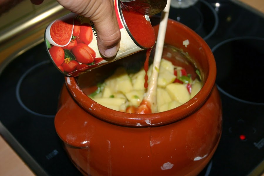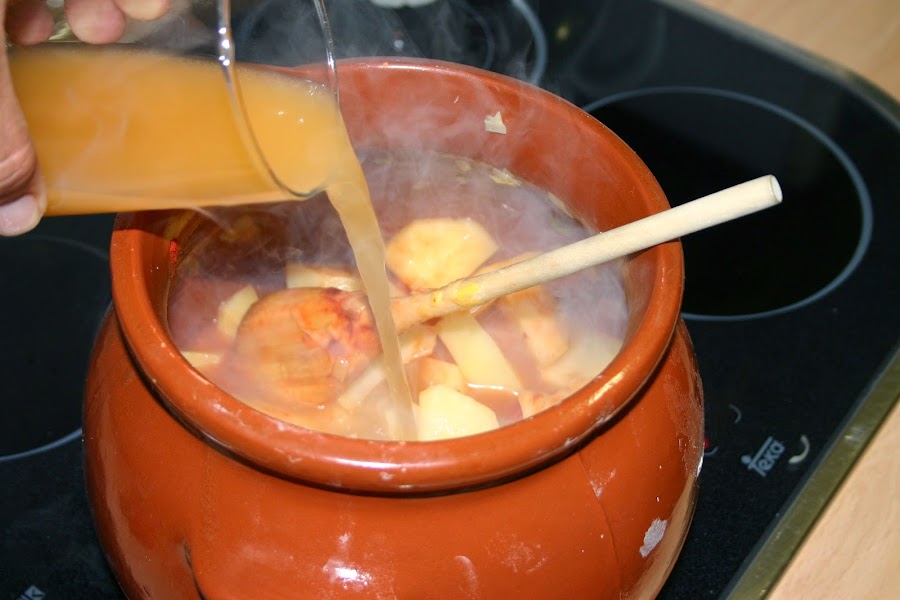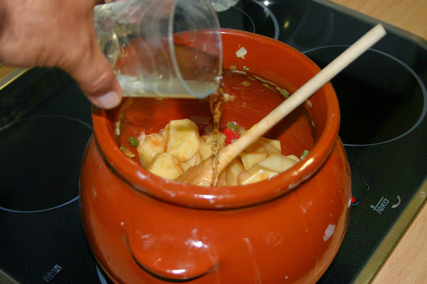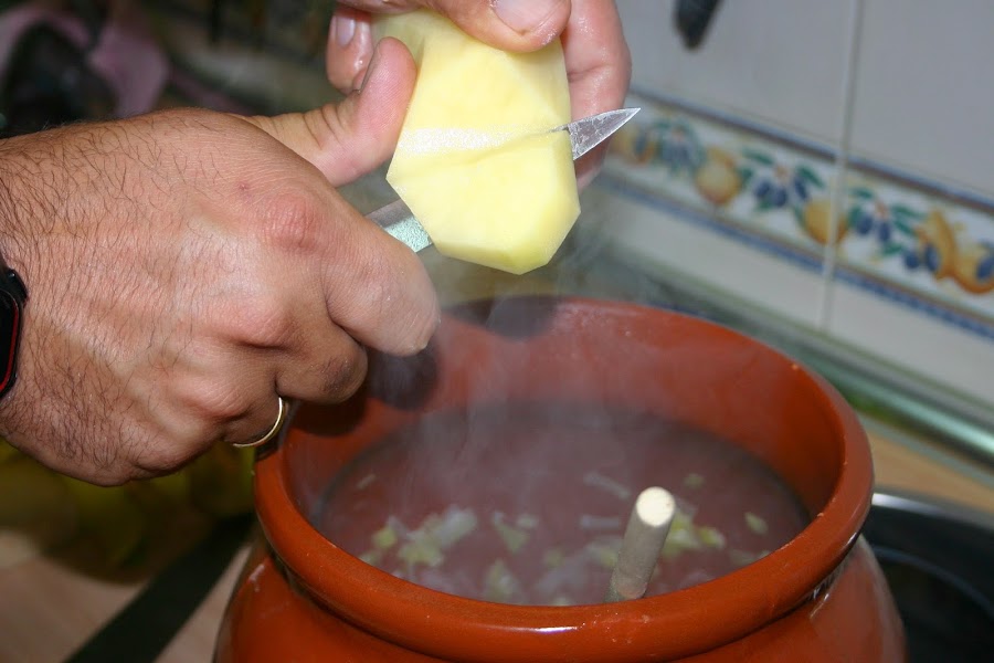una vez bien pochado, desgarramos la patata y la vamos echando a la olla