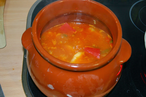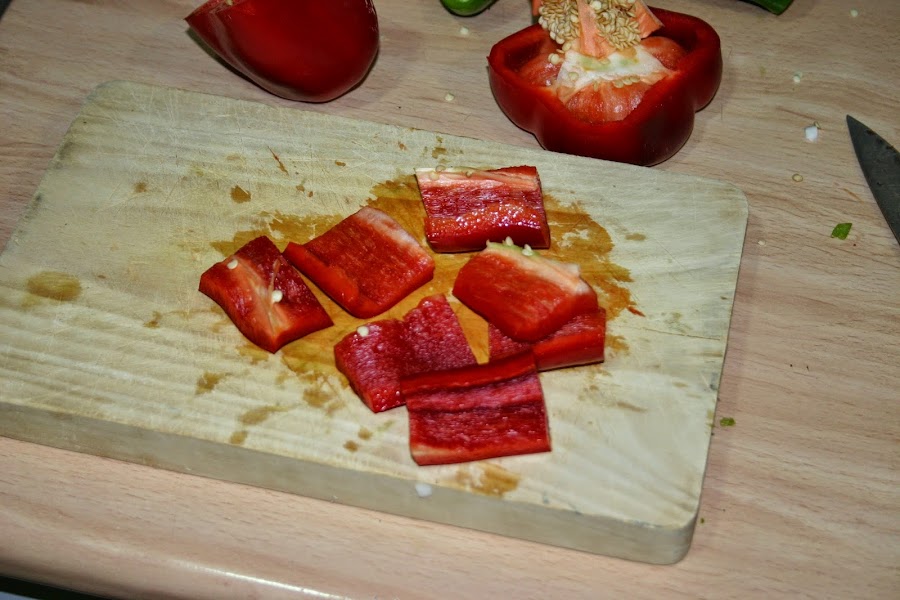 y mas de lo mismo con el pimiento rojo, que como a mi no me va mucho, lo pico en grande para poder quitarlo luego(jejejeje)
