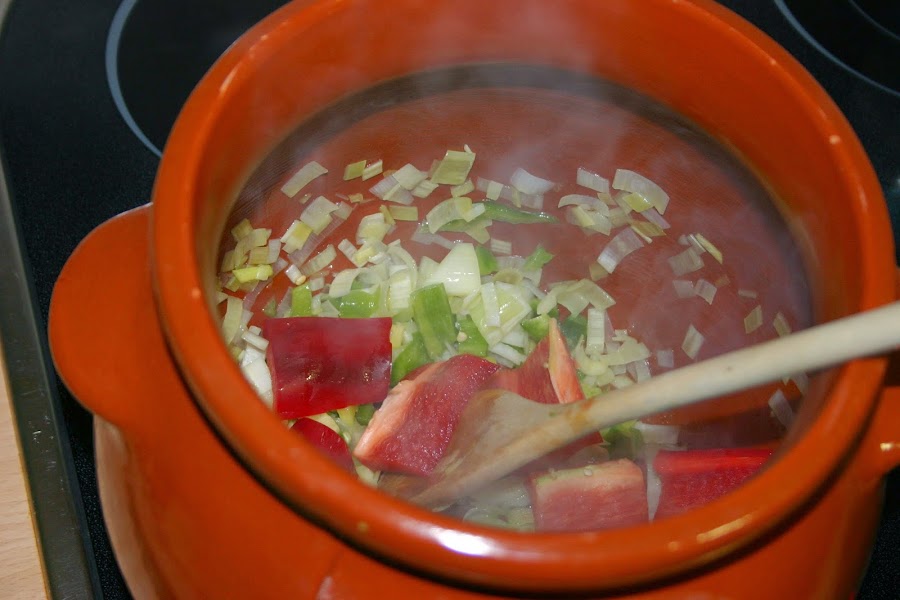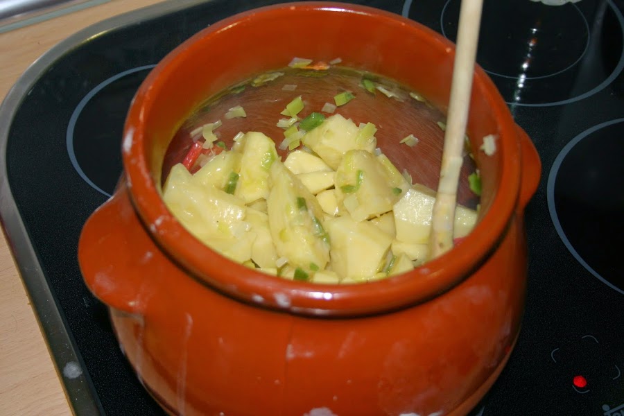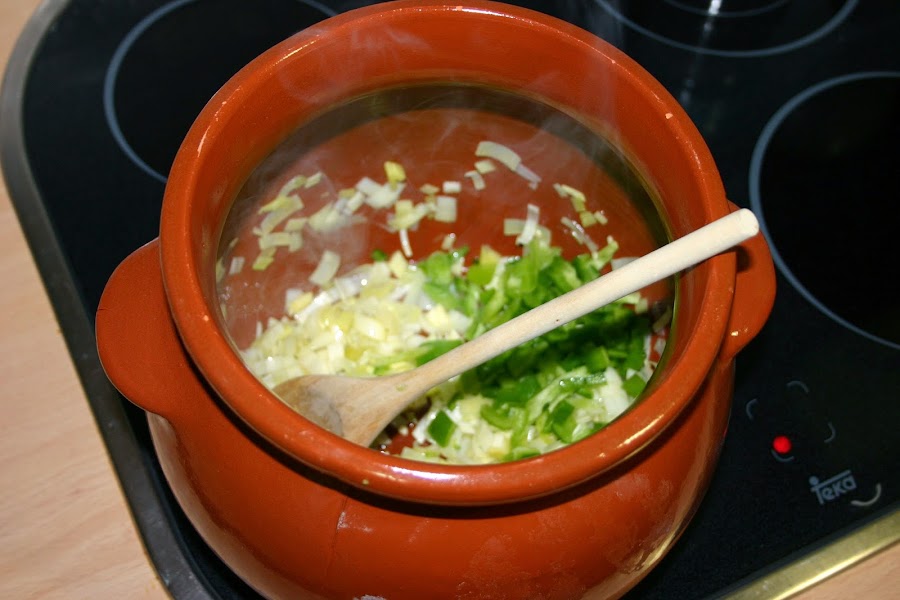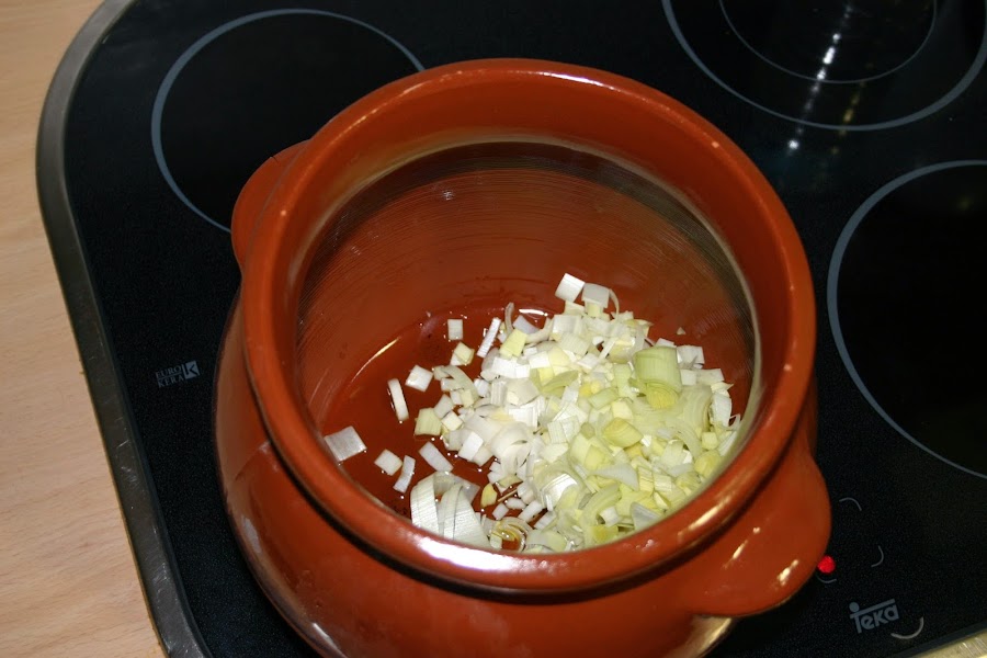 en el fondo de la fuente de barro ponemos aceite e introducimos el puerro, ponemos a fuego medio