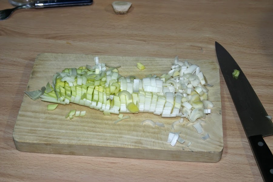 y lo unimos en la cazuela con el puerro y el verde, salamos y lo pochamos todo bien
