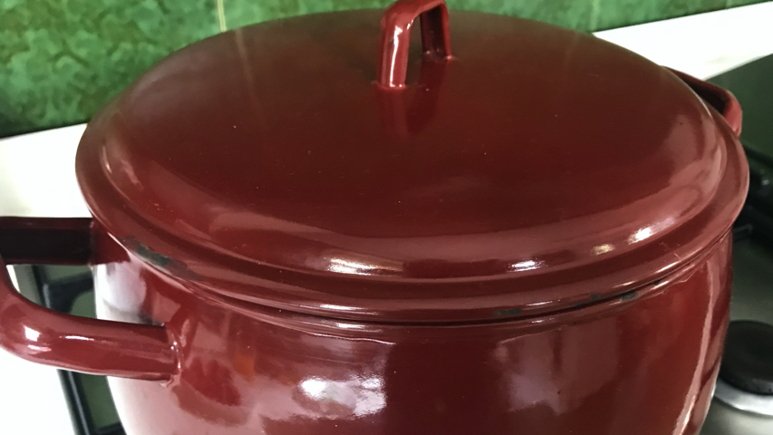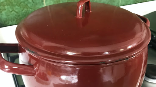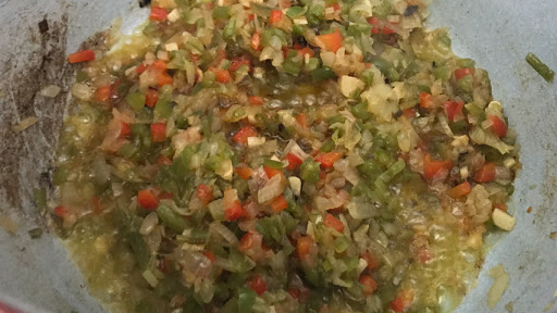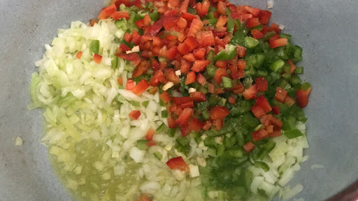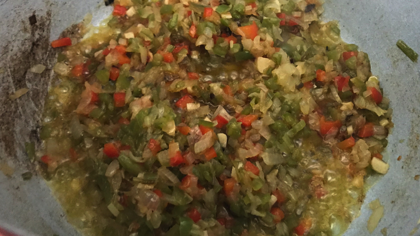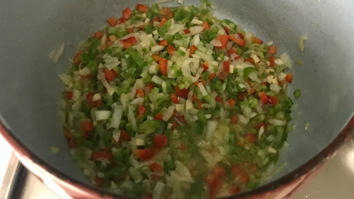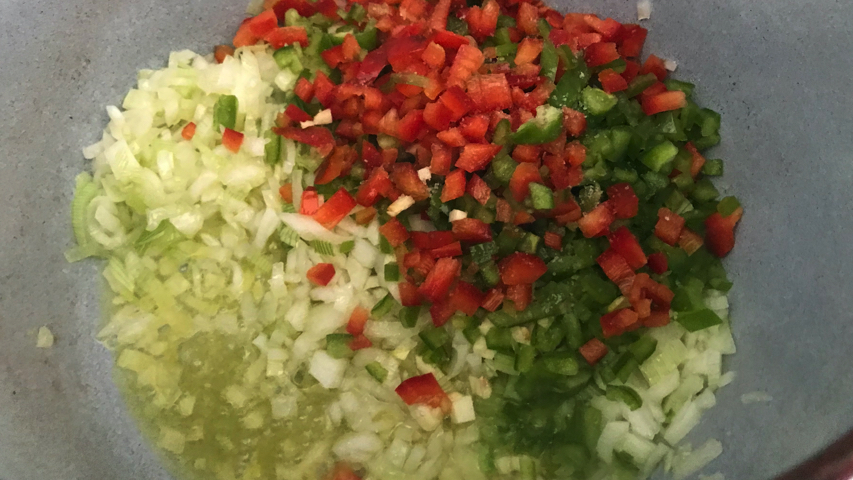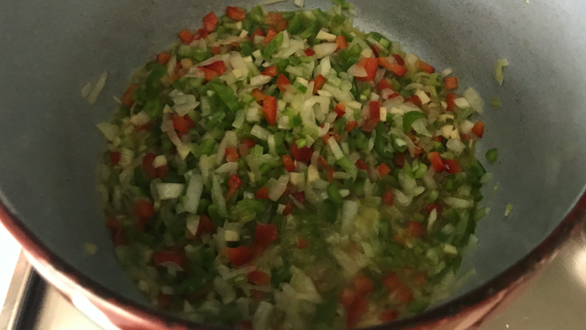 Prepara la olla (marmita) a fuego medio-alto y sofríe la cebolla, el ajo y los pimientos verde y rojo.