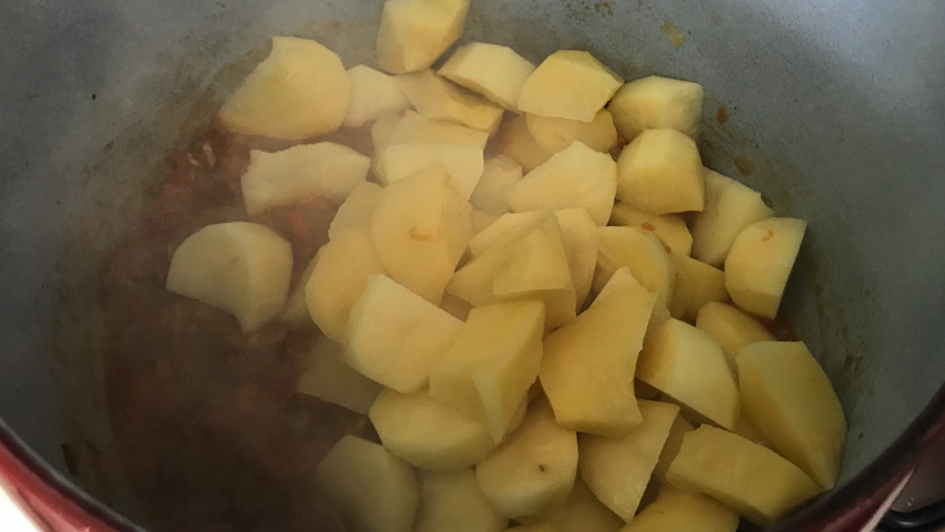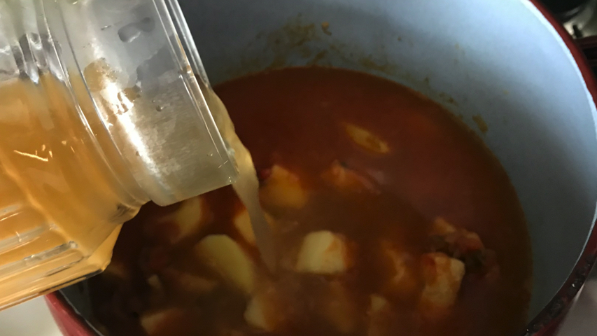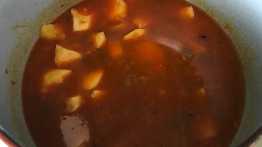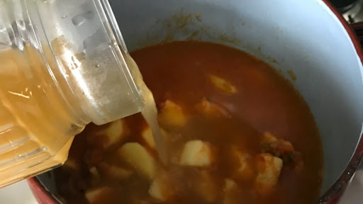 Baja el fuego y deja cocer hasta que la patata esté tierna. Si crees que necesitara algo más de caldo durante la cocción, añádelo sin miedo.