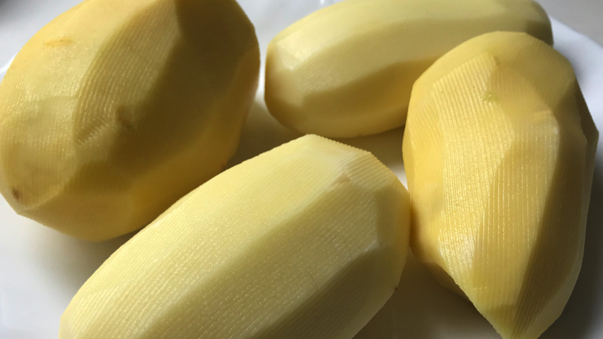 Pela las patatas y córtalas chascándolas en trocitos de bocado. Reserva.