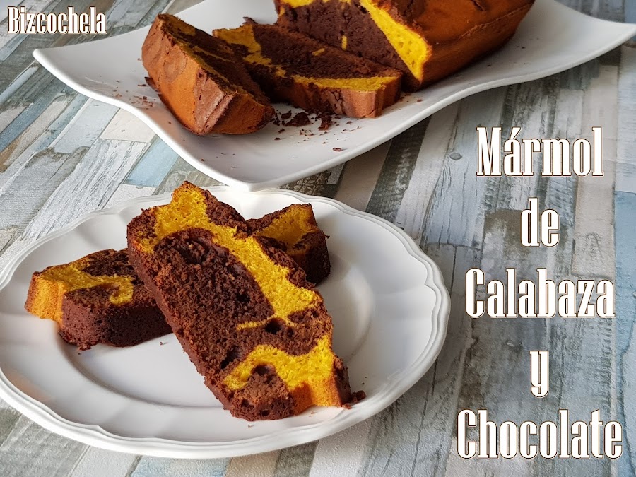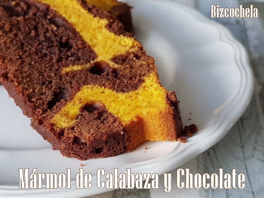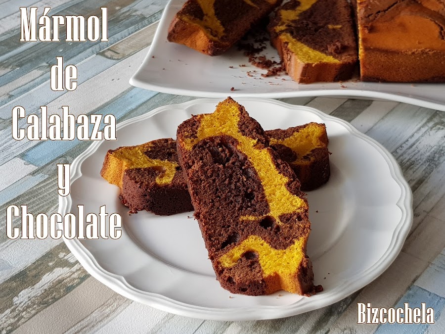 No le he puesto el nombre de bizcocho, porque es más húmedo que el bizcocho, ya que la calabaza le aporta ese punto de humedad, tampoco es una tarta, ni un pastel, así que como queda el resultado como un bizcocho mármol, pues nada, bautizado queda así.