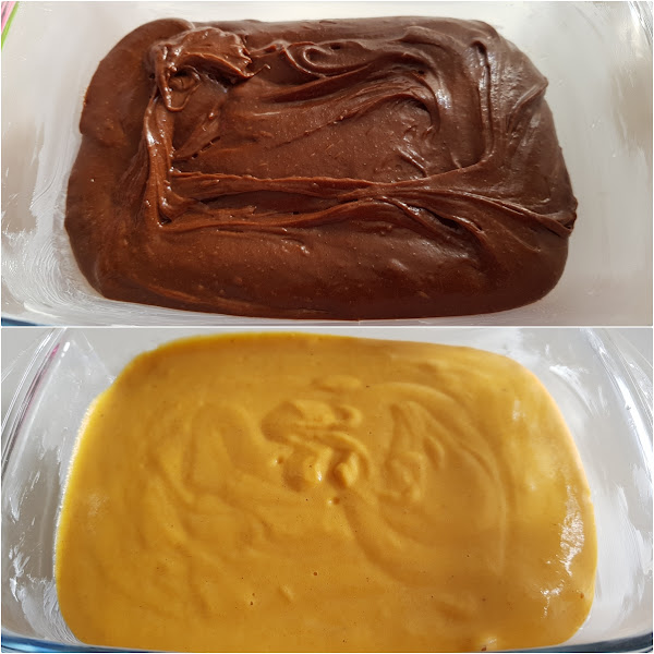 7. - Una vez y tenemos las dos masas bien mezcladas, en un molde engrasado, echamos el fondo con la masa de chocolate y luego ponemos encima la masa de calabaza.