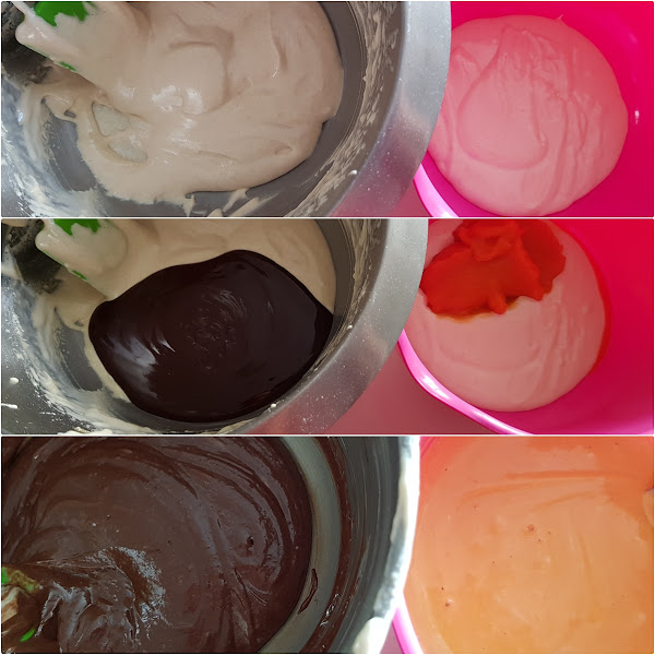 6. - Echamos la mitad de la masa en otro bol. En uno añadiremos el chocolate derretido y en otro añadiremos la calabaza con un poco de nuez moscada y un poco de canela.