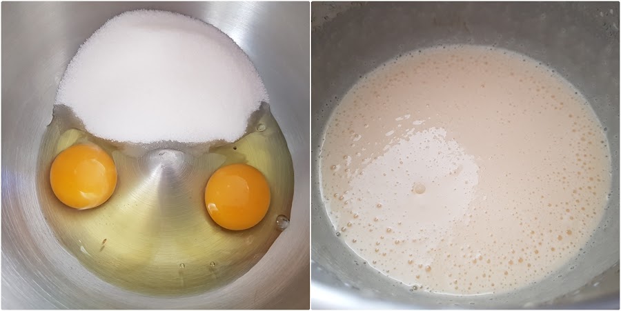 4. - En un bol ponemos los huevos con el azúcar y batimos hasta que blanquee y quede esponjoso.