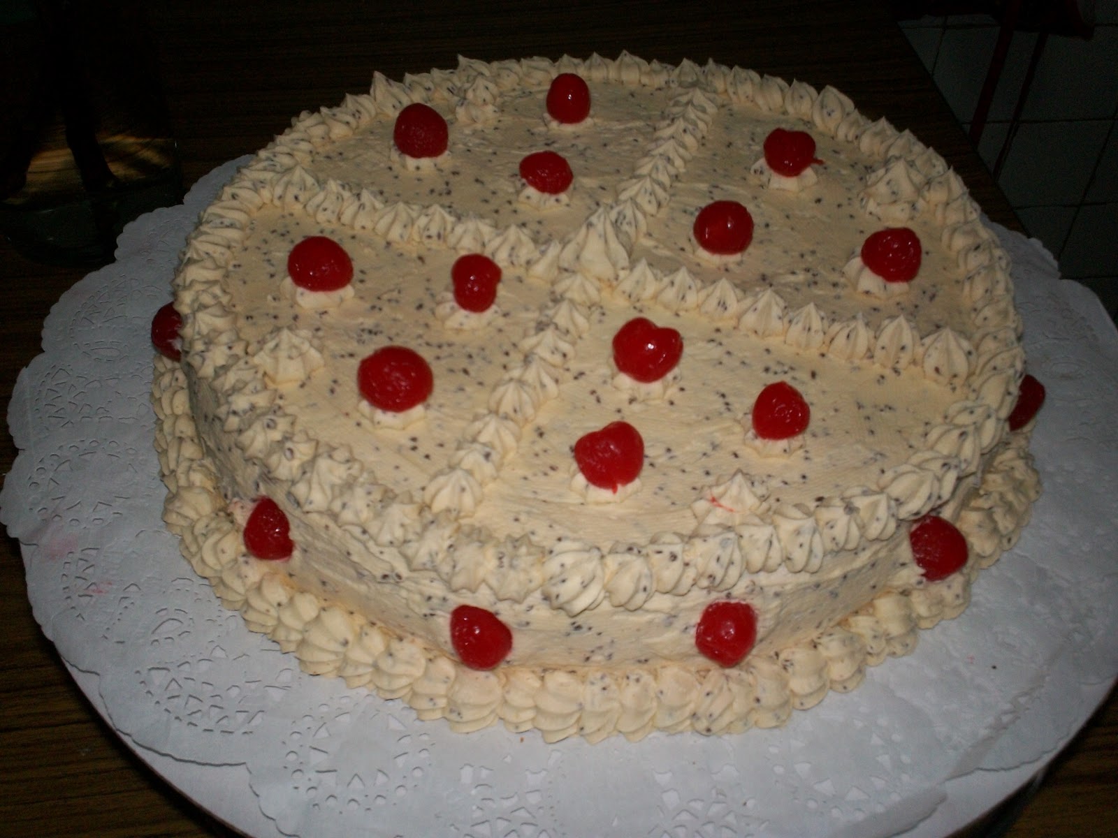 Desmontar la torta y cubrirla con la crema de chocolate que había quedado. Adorne con las guindas.