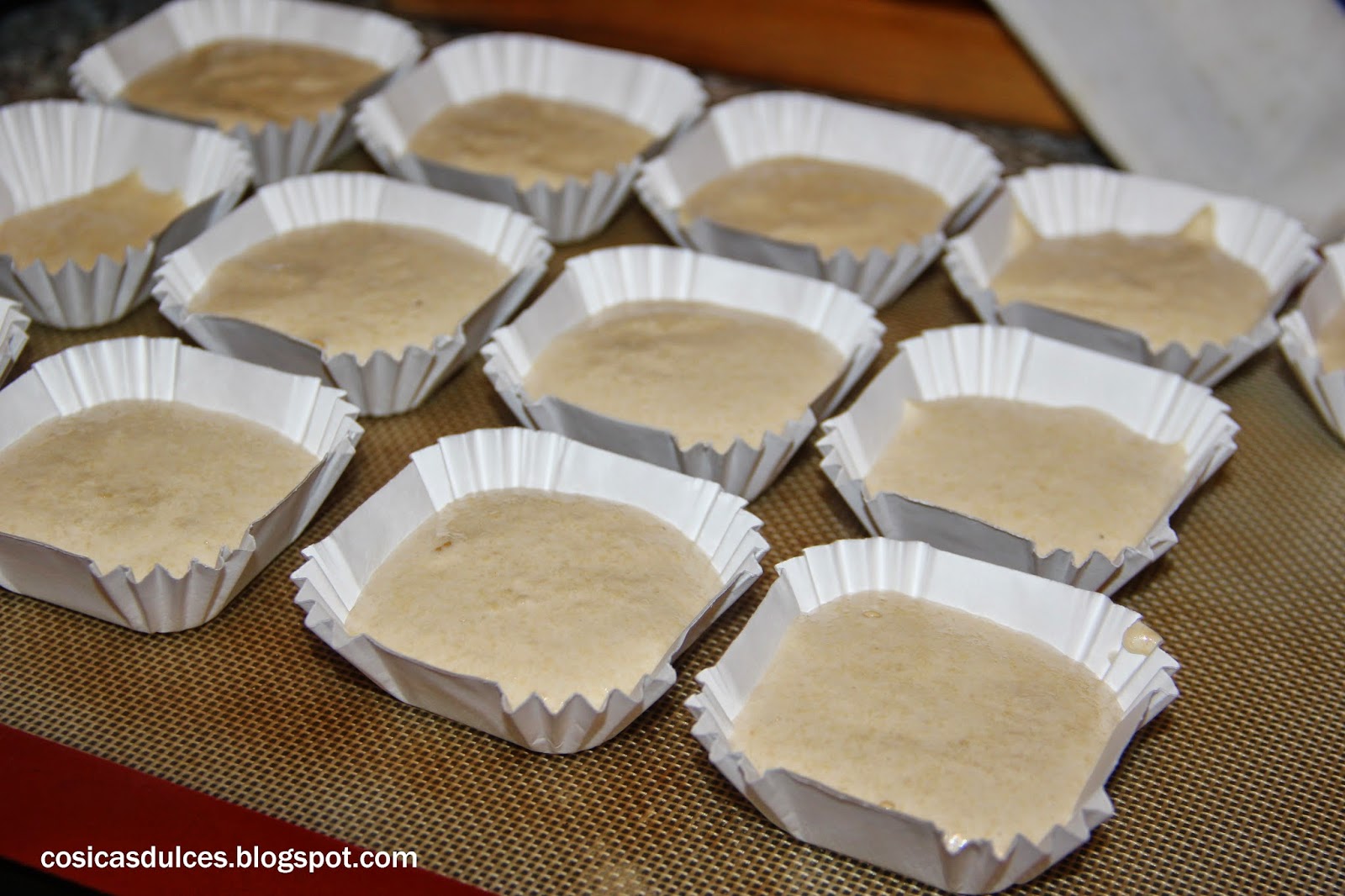 Vertemos la masa en las cápsulas y horneamos a 180º (con el horno precalentado) entre 20 y 30 minutos.