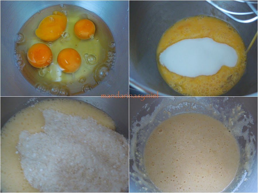 Bate los huevos, añade el azúcar normal y sigue batiendo hasta que blanqueen.