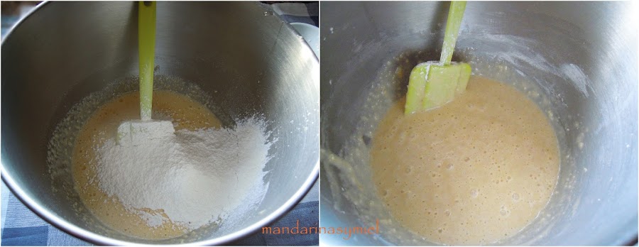 Cuando estén todos los ingredientes bien integrados, añade las harinas y sigue mezclando con cuidado.