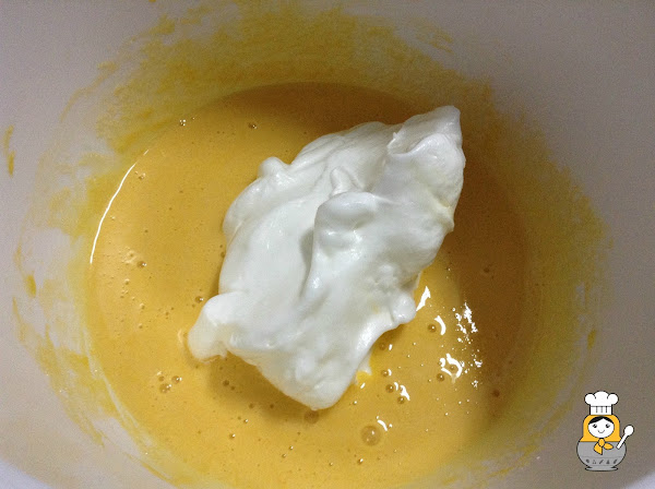 En el otro bol, ponemos las yemas con las dos cucharadas de miel. Mezclamos bien y añadimos el las claras.