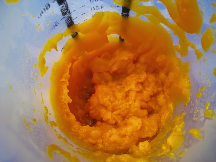 Pelar la calabaza y córtala en trozos ponerla en el horno precalentado 180º , 15 minutos para que este blanda y después triturar con la batidora.