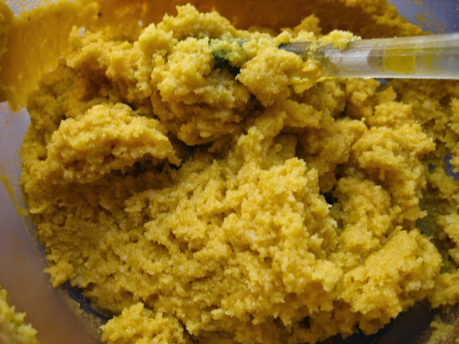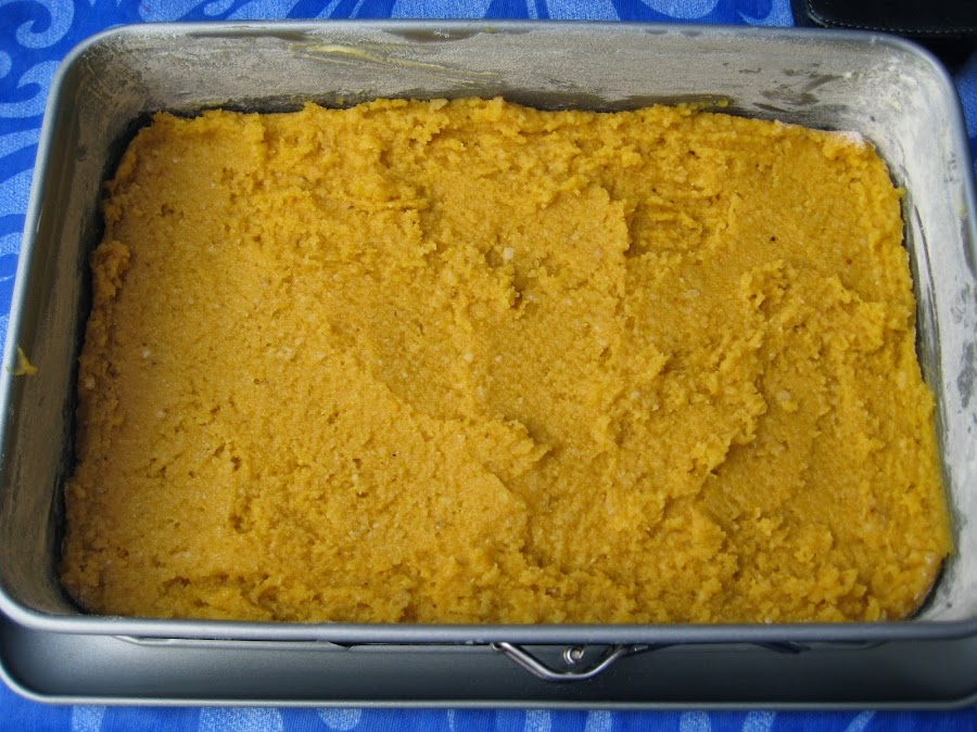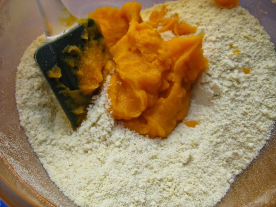 Incorporar la harina y la levadura tamizada hacerlo con movimientos envolventes agregarle una pizca de sal y la almendra molida, por último la calabaza, mezclar muy despacio.