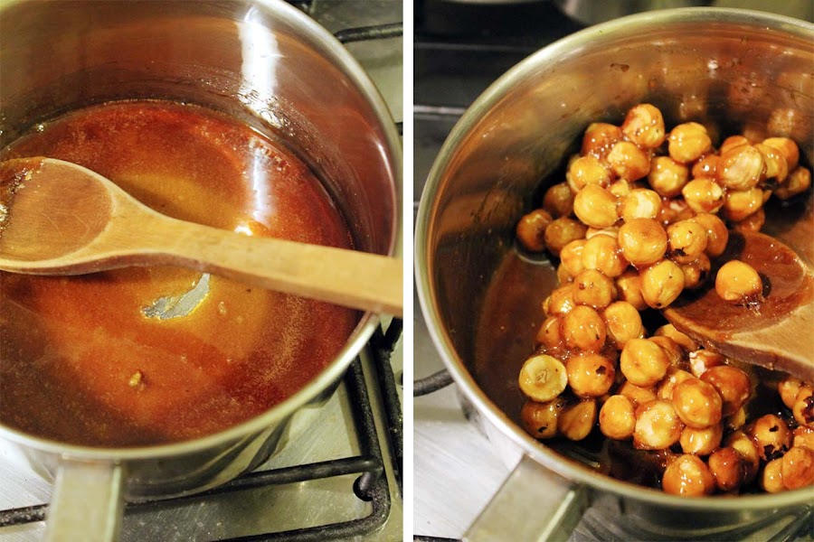 - Hacer un caramelo rubio en una cacerola e incorporar las avellanas