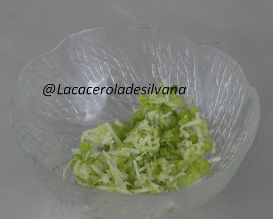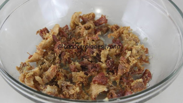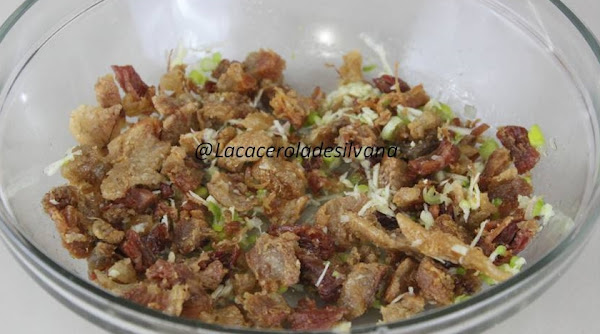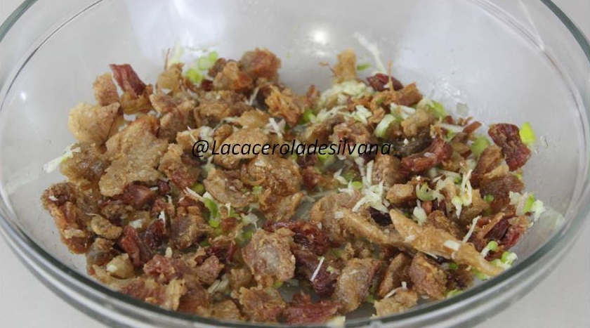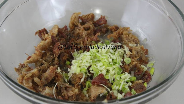 Luego se procede cortar la cebolla en rama o de verdeo y el ajo finamente, se mezcla con el chicharrón y se reserva.
