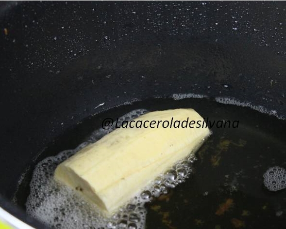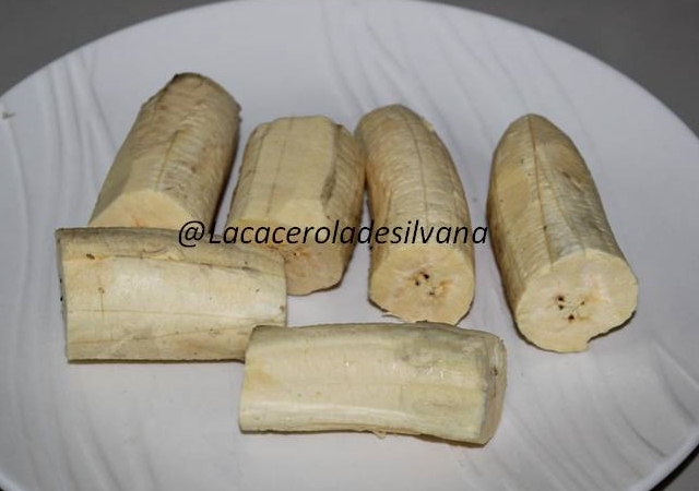 La segunda parte de esta preparación, consiste en preparar el plátano y para esto lo que se debe hacer es pelarlo y cotarlo en tres partes.