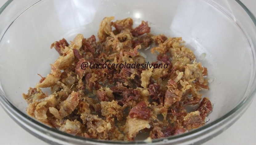 Se le agrega un poco del agua con sal y se le coloca una chucharada del chicharrón con la cebolla y el ajo