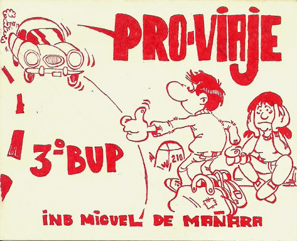 Pues para los que no lo sabéis, se trata de la pegatina que hicimos para sacar dinero para el viaje de fin de curso. Este viaje se hacía cuando estábamos en 3º de BUP, ya que era el final de un ciclo. Los que queríamos hacer una carrera pasábamos a COU (curso de orientación universitaria), otros pasaban a lo que era la FP (formación profesional) o un módulo como se llama ahora, y otros, simplemente dejaban de estudiar.