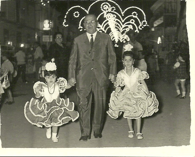 Esta foto fue hecha hace un chaparrón de años en la feria de mi pueblo. Bueno en la feria del Corpus Christi que celebrábamos antes, ahora solo tenemos la de la Virgen del Rosario en Octubre. El señor que lleva de la mano a las dos niñas, es mi abuelo materno, Juan José. La niña mayor soy yo y la más pequeña es mi prima hermana María José, mi querida prima Mari. La que quiero como una hermana. La señora que se ve de fondo, es mi abuela materna, Antoñita. Así que ya habéis conocido a mis cuatro abuelos ;)