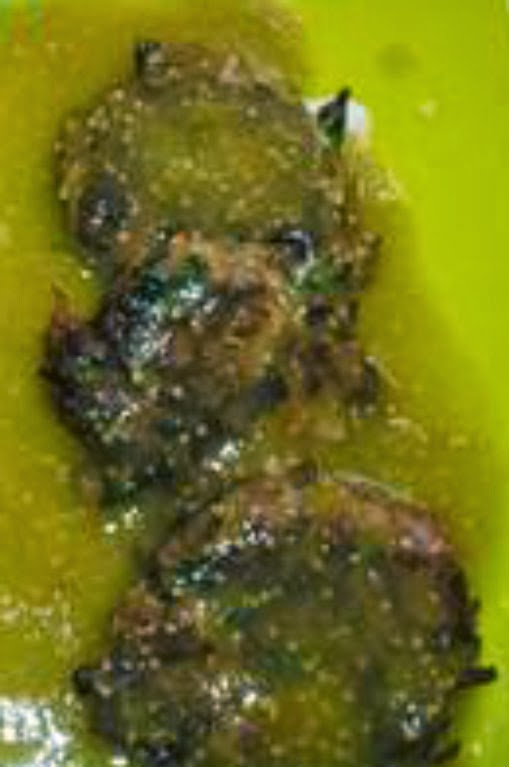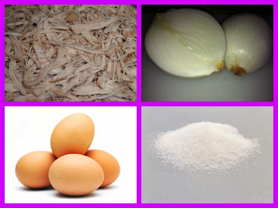 se pone a cocer la carne con un pedazo de cebolla y sal, una vez cosida se deja enfriar y el caldo restante se reserva, ya que este fría se deshebra y se coloca en un táper hondo se le agrega la cebolla, los huevos y la sal, en un sarten se pone a calentar aceite suficiente para freír las tortitas el tamaño es una cucharada sopera por cada tortita, una vez fritas se reservan en papel absorvente.