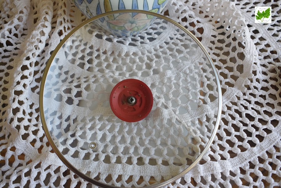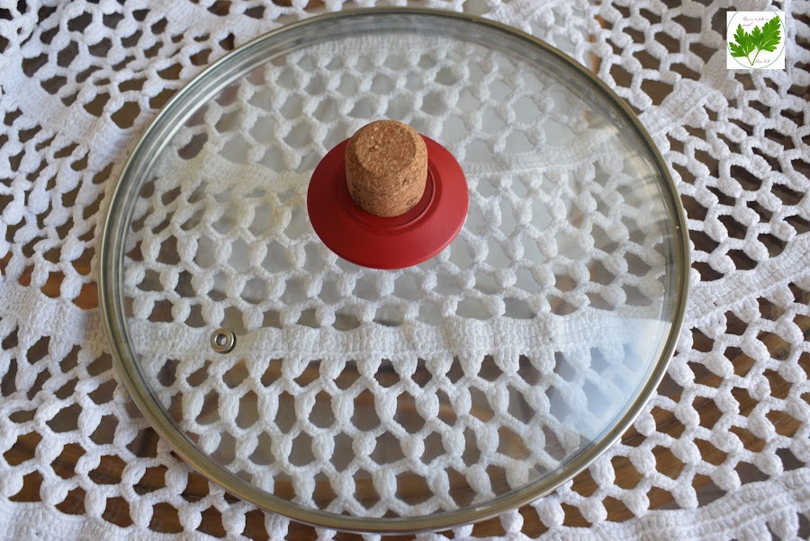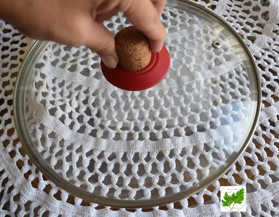 Días más tarde, se rompió el pomo de esta tapadera que me da mucho avío en la cocina, es perfecta para el tamaño de algunas sartenes y cuencos. Necesitaba comprar uno, pero las ferreterías no se consideraron establecimientos de primera necesidad permeneciendo cerradas durante el confinamiento. Miré en Amazón y tardaban mucho en enviarlas, además me obligaban a comprar juegos de tres o más. Buscando la marera de arreglarla, encontré en un cajón el tapón de corcho de una botella de cava. Siempre guardo algunos y, de repente, me vino la idea.