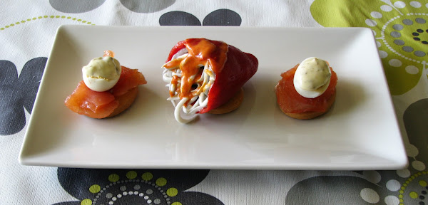 - Colócalos sobre las galletas y vierte por encima un poco de la salsa de pimientos.