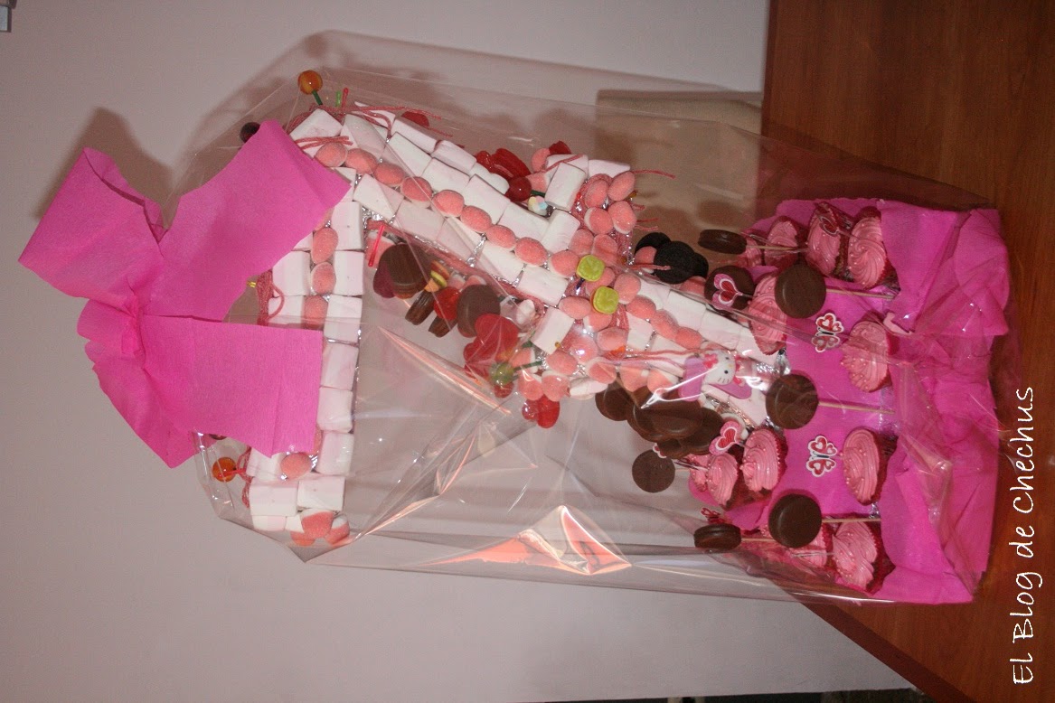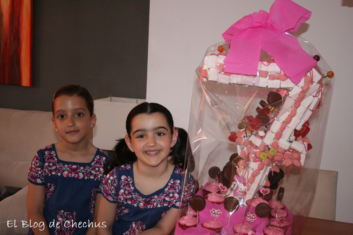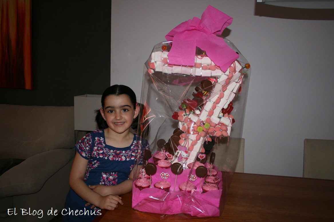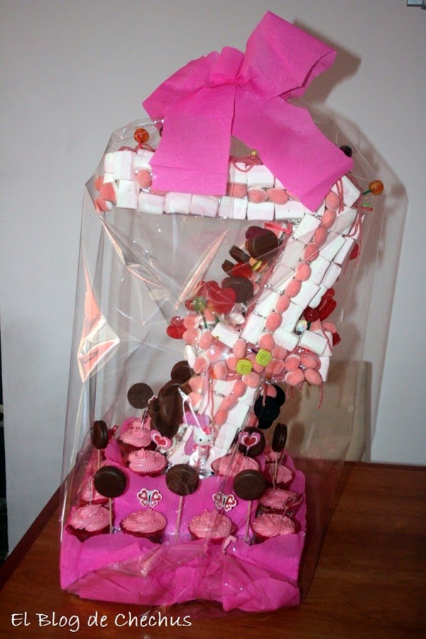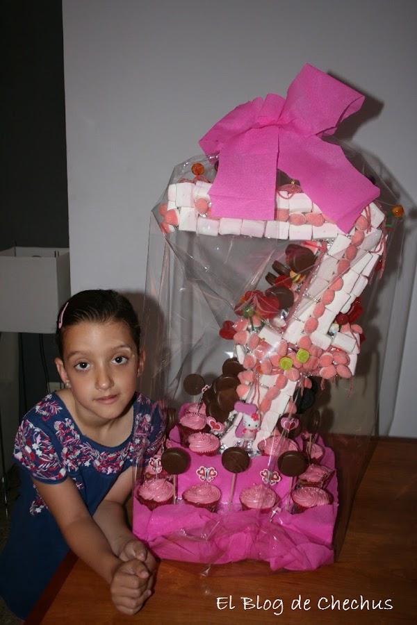 No quería dejar pasar la ocasión de enseñaros la tarta de cumple que les hice a mis hijas el año pasado.Que mejor para unos críos que una tarta de chuches , aunque tengo que deciros que a los mayores también les gusto mucho.El montaje muy fácil, lo complicado era hacer el siete, pero lo tuve fácil. Mi amigo del trabajo Luis , también conocido como "mestre tacha", se curró el siete con unos trozos de corcho.Desde aquí le doy las gracias, pues es medio "artista fallero" y eso se nota... Después compre un montón de chuches y de palillos y forramos el siete con papel de aluminio y ¡¡¡ a clavar !!!. Las niñas me ayudaron y la verdad es que nos lo pasamos bomba. Añadimos también unas cupcakes y unas oreos clavadas también para que no se movieran. Ya sabéis,,, otra idea de tarta de cumpleaños.
