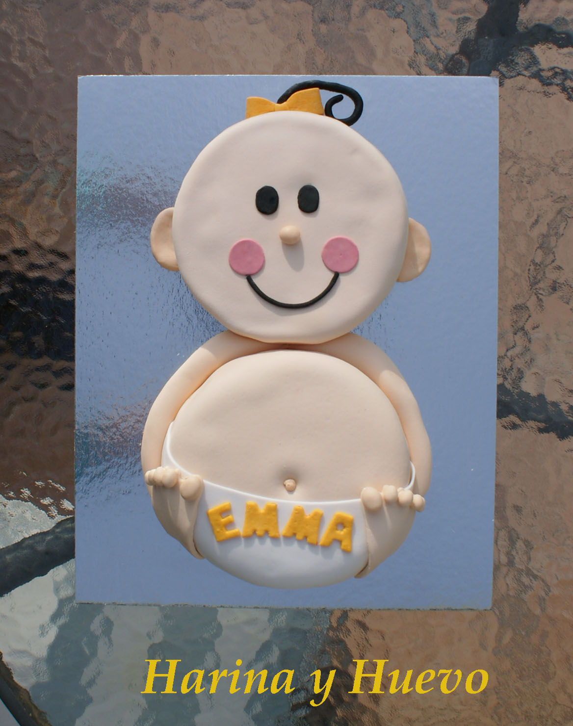 Está también me gustó mucho como quedó, es una idea que podéis encontrar en la página de Wilton. Me la pidieron expresamente y la personalizamos con un lazo en el pelo, el nombre de la niña y el ombliguito. Y como a la madre no le gusta el rosa, pues amarillo. Además lo bueno que tiene esta tarta es que son dos en una así que cada parte es de un sabor. A la persona que me la encargó no le gusta el chocolate pero al 90% de personas sí, así que hicimos una parte de chocolate y la otra de mi mermelada de plátano casera.