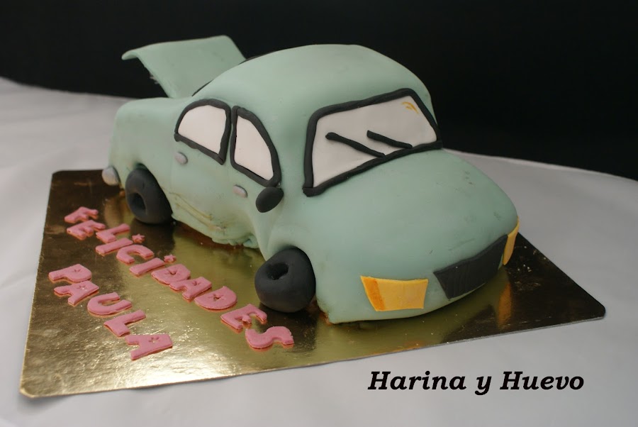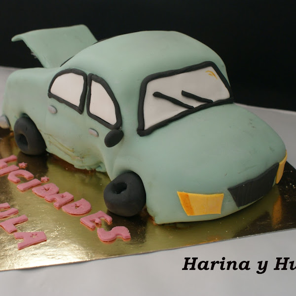 Esta primera tarta es un "coche destrozado", no es que se me haya caído la rueda y me haya salido un golpe en el lateral, es que es así. Y lo mejor: lleva una bombona de butano en el maletero, no preguntéis porqué, toda tarta tiene su historia y como son 100% personalizables...