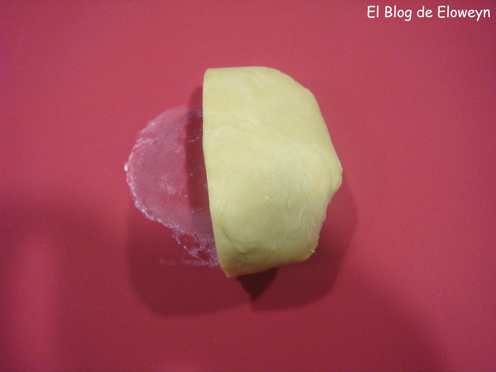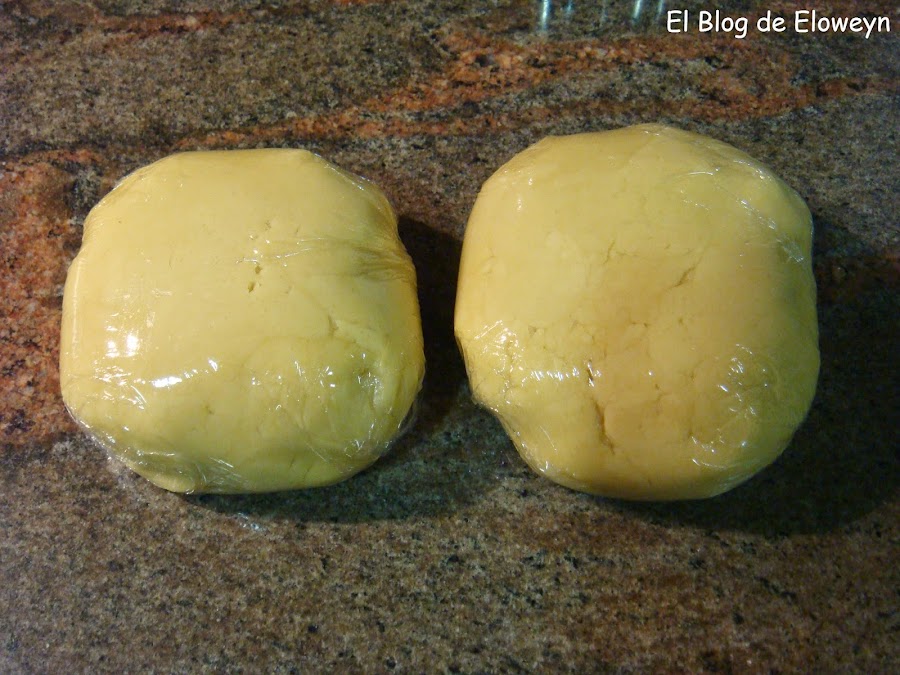 Sacar la masa, hacer una bola y envolverla en papel film. Yo la dividí en dos partes. Meterla en la nevera durante unas 4 ó 5 horas (Yo las dejé de un día para otro).