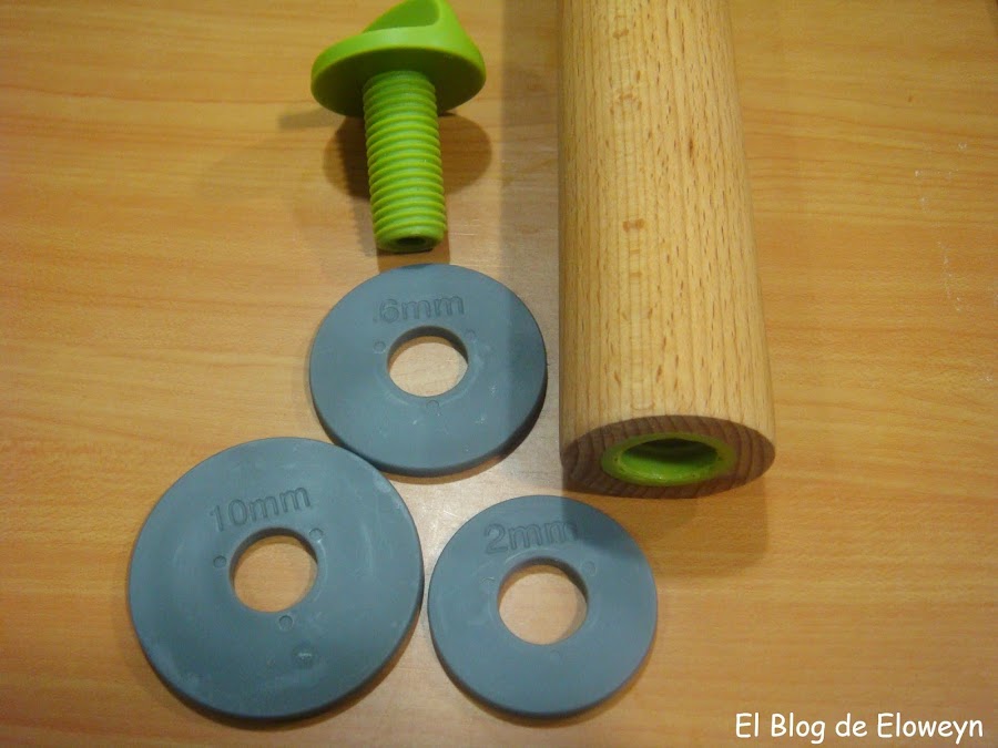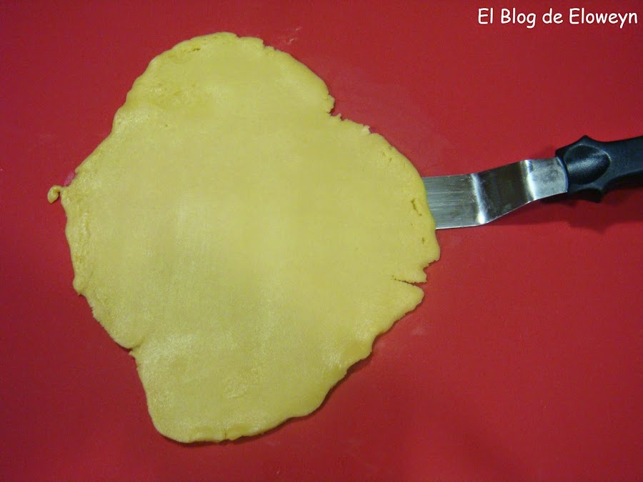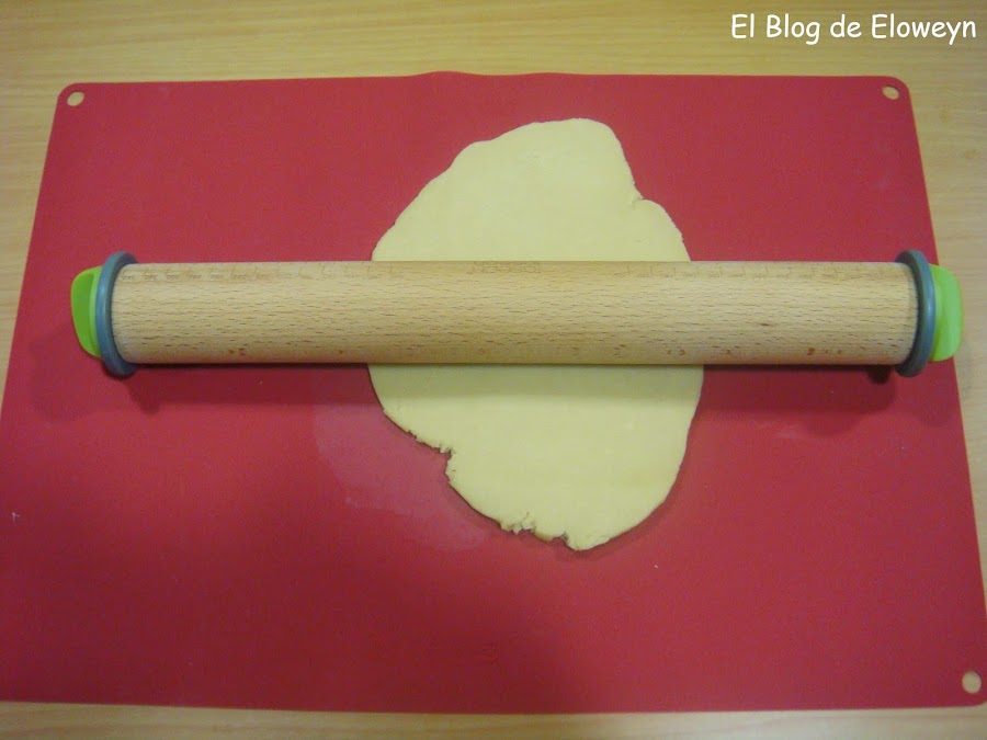 Yo tengo un rodillo especial que tiene unos aros más gruesos que se usan como tope, para que la masa quede de igual tamaño en todos los lados. Si no lo tenéis, calculad más o menos un grosor de unos 6 milímetros.