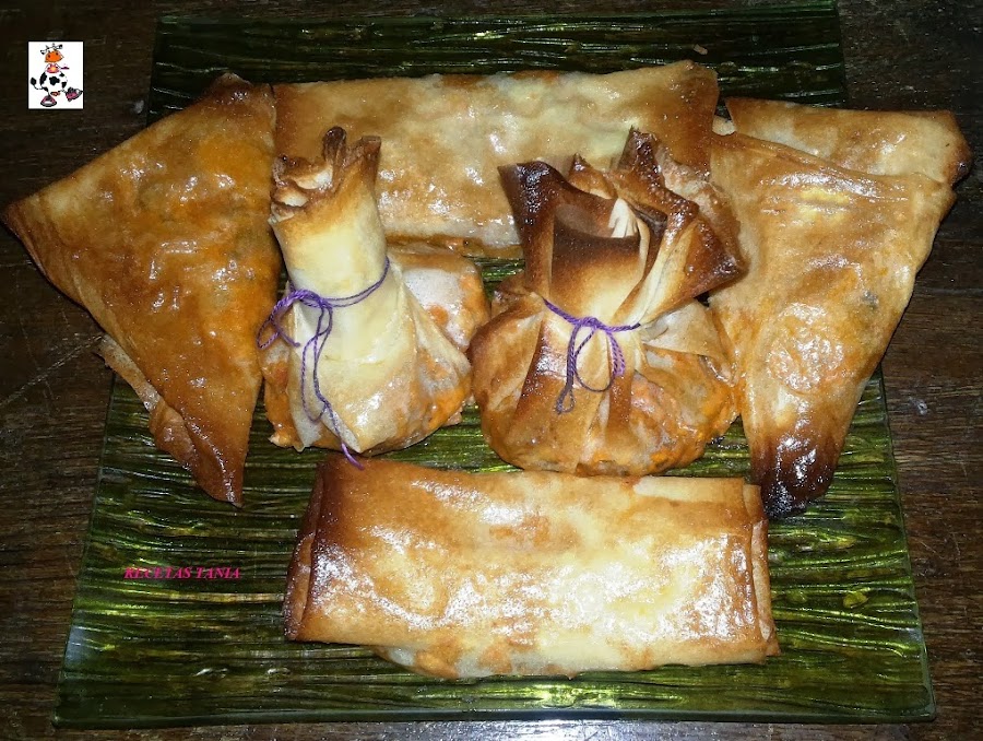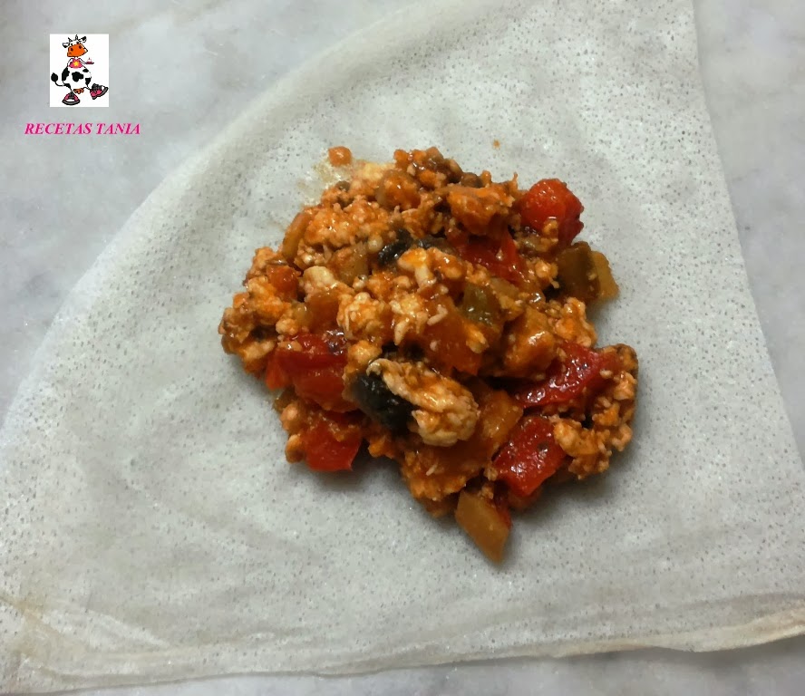 los pimientos bien picaditos y sofreímos,cuando este doradito añadimos el tomate bien picado y removemos,añadimos la pechuga de pollo picada,un poquito de orégano y un poquito de sal,removemos bien, en un almiré picamos bien los ajos, añadimos a la sarten y dejamos que se haga el pollo. Añadimos el tomate frito y vamos removiendo,apagamos el fuego,dejamos que repose unos 30 minutos. Rellenamos la masa brick,yo hice triangulos,rollitos y saquitos. Colocamos la masa rellena en una bandeja de horno,pintamos con un huevo batido y al horno unos 10-12min a 200º. Sacamos,emplatamos y a comer!!!