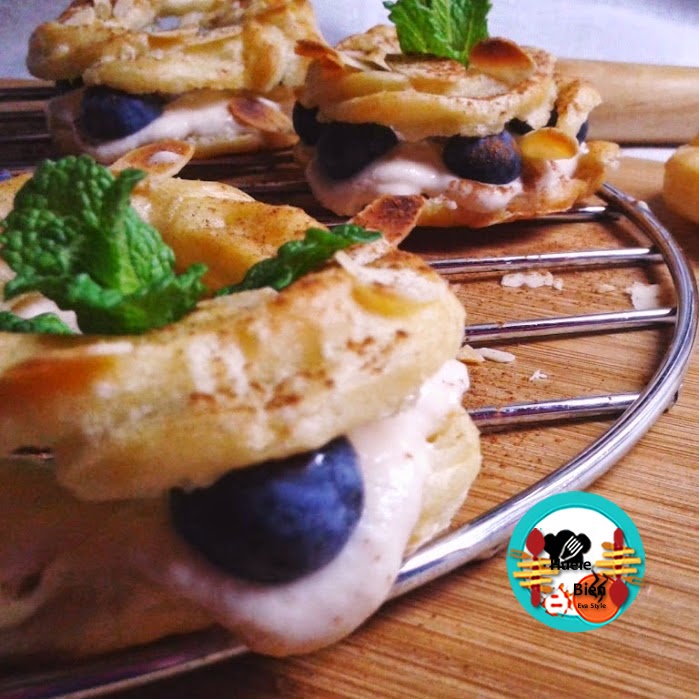4.- Preparamos el relleno. Batimos el queso con la nata (crema de leche) y el azúcar. Con una manga pastelera rellenamos los rosquillas. Lavamos y secamos los arándanos. Ponemos 4 o 5 por rosquilla. Esparcimos sobre ellas, canela en polvo o azúcar glas.