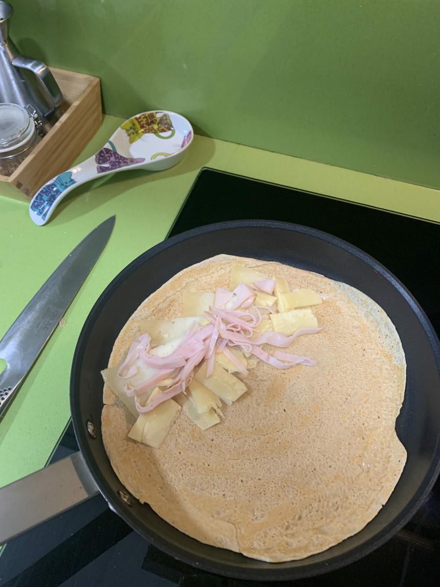 Una vez las queramos comer calentamos una sarten antiadherente y ponemos un poco de aceite y repartimos con un papel. Y vamos poniendo masa para que nos cubra la sarten pero que no quede muy gruesa. Una vez se despegue le damos la vuelta y en ese momento podéis poner los ingredientes si quieres que queden caliente por ejemplo yo he puesto el queso y el pavo. Pero podéis poner azúcar o crema de cacao. Retiramos y servimos.