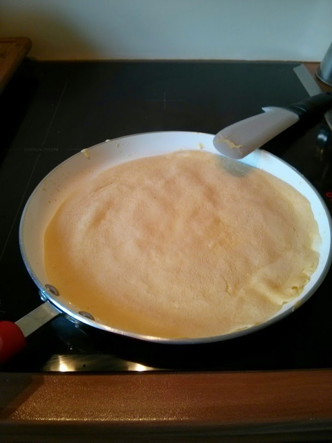Echamos un chorrito de masa y rapidamente la extendemos con una espátula por toda la base de la sartén. Cuajamos por los dos lados y sacamos a un plato donde pondremos el relleno y enrollaremos.