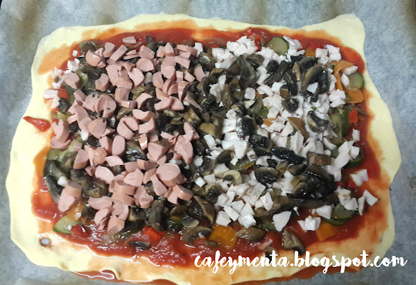Con el rodillo y con la superfície de trabajo previamente harinadas, estiramos hasta que quede una masa fina. Entonces colocamos la masa de la base sobre la bandeja en la cual la vamos a hornear, y le ponemos el relleno.